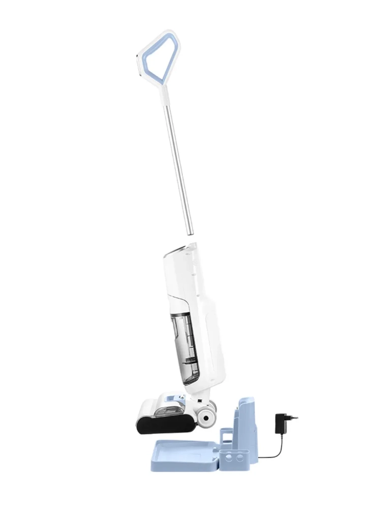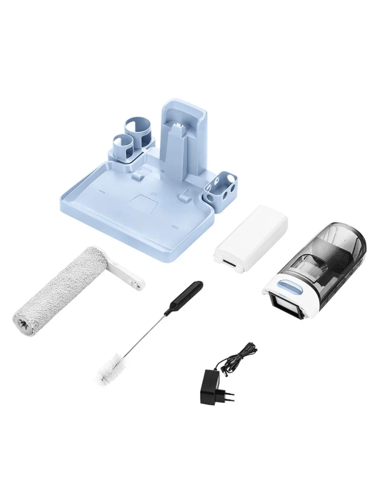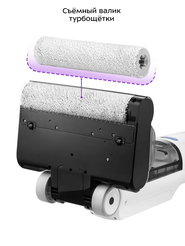 Удлинительная ручка съемная, поэтому прибор можно разобрать для компактного хранения. Для хранения предусмотрена база, на которой устройство заряжается. На базе есть отсеки для просушки валика турбощетки и хранения ершика.
