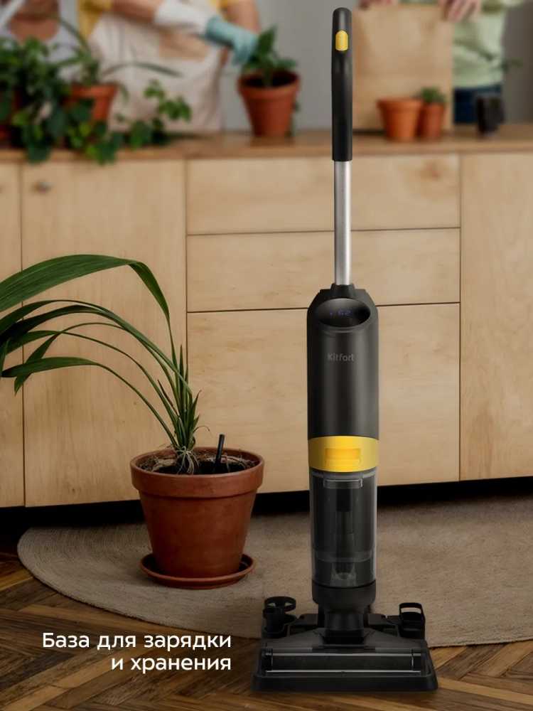 Беспроводной вертикальный моющий пылесос Kitfort КТ-5258 очень удобен при проведении влажной и сухой уборки. Благодаря работе от аккумулятора во время использования пылесос не нужно включать в сеть и провод не будет мешать под ногами.