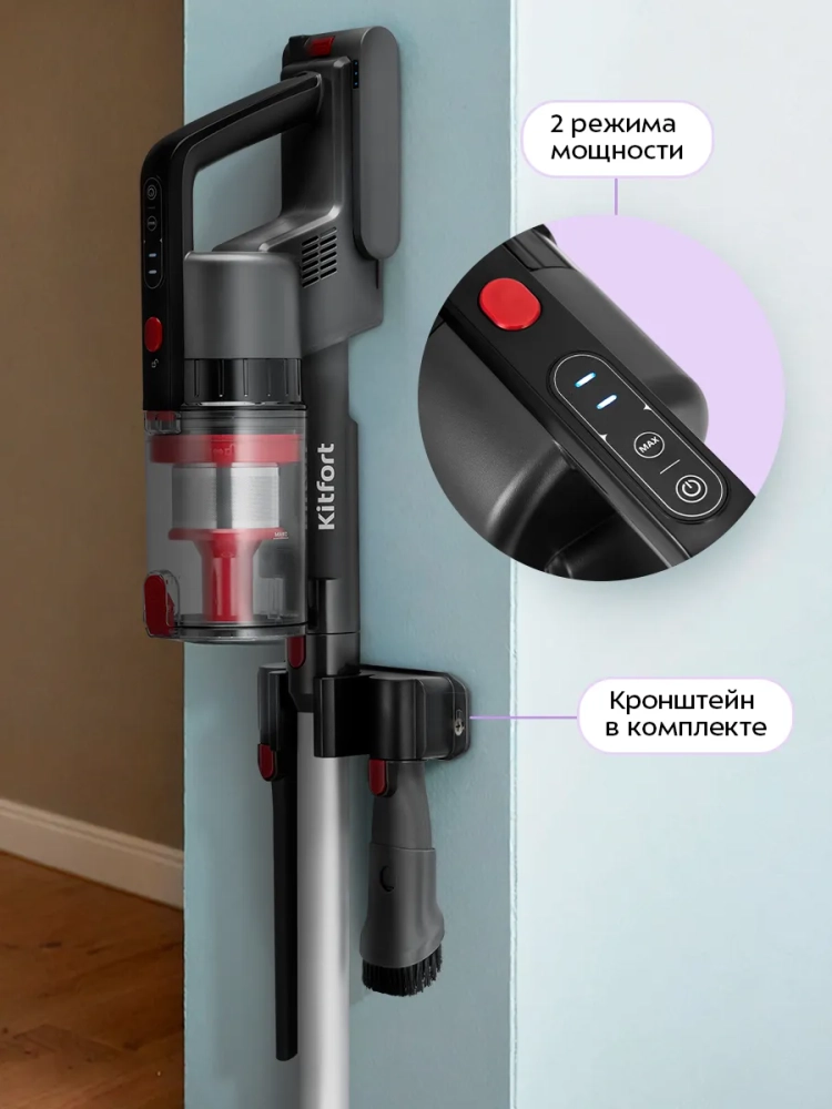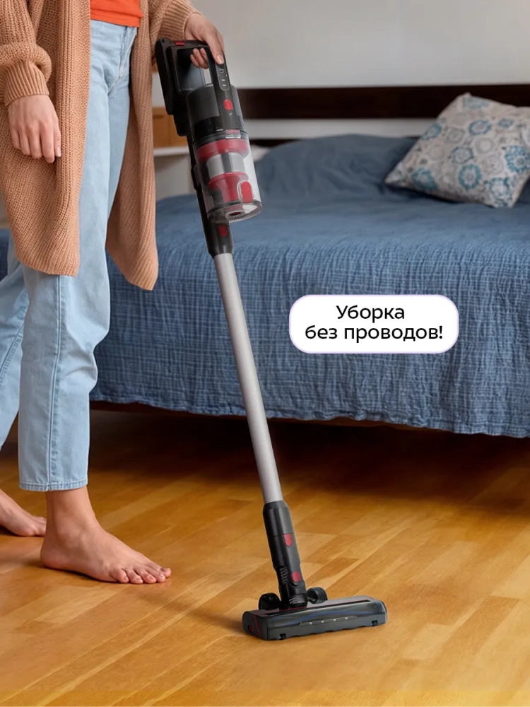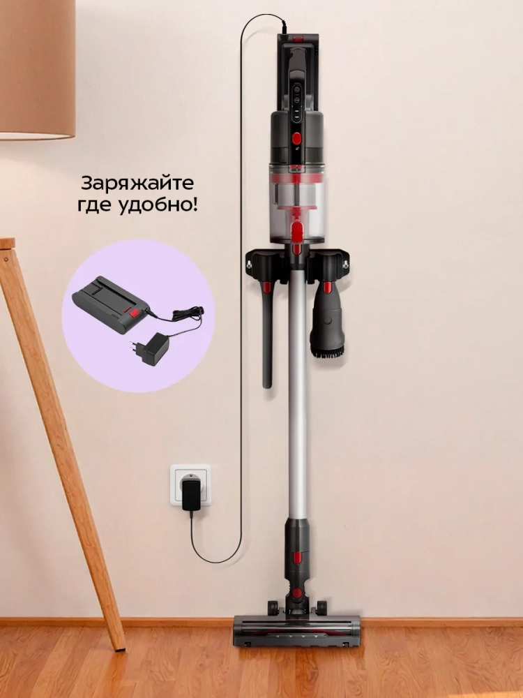 Одно из главных достоинств вертикального пылесоса — его компактность. Во время работы пылесос благодаря своей маневренности поможет легко убраться в узком коридоре или комнате, заполненной различными предметами. У пылесоса нет функции вертикальной парковки, поэтому пылесос рекомендуется устанавливать на кронштейн из комплекта, который крепится к стене.