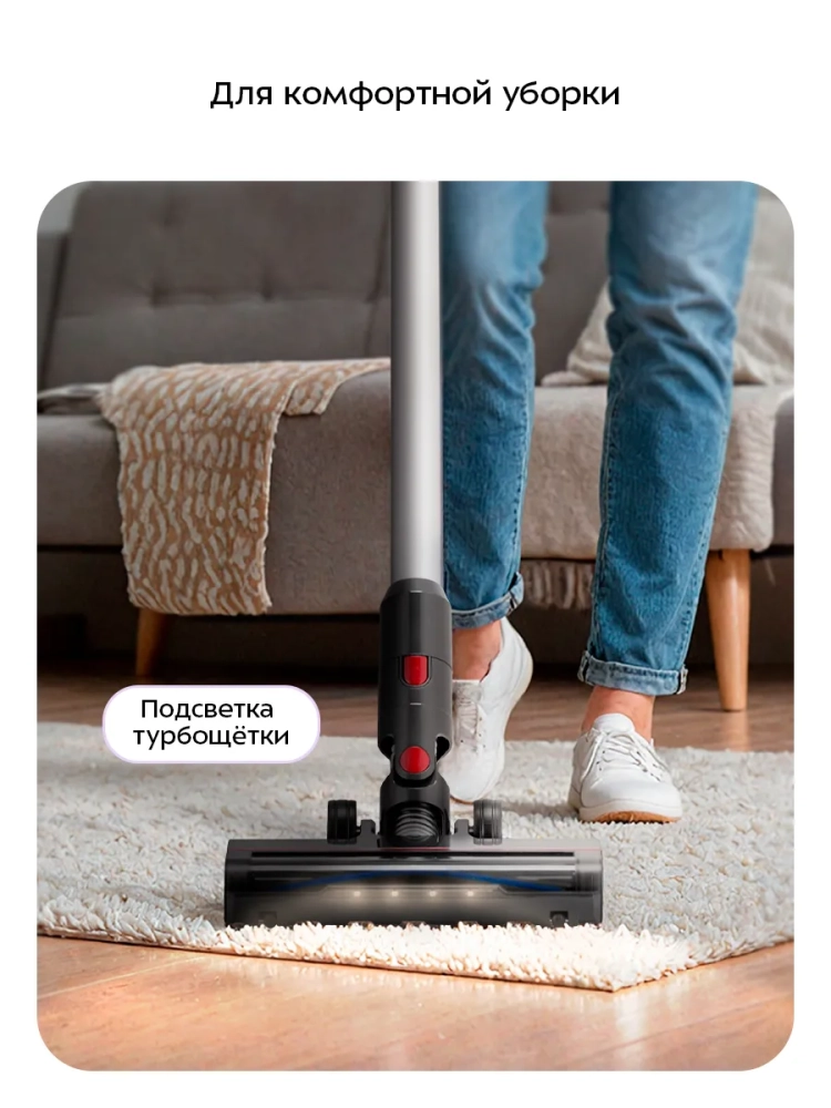 Пылесос комплектуется напольной насадкой с турбощеткой, которая помогает качественно справиться с очисткой гладких поверхностей и ковровых покрытий с не очень длинным ворсом. Светодиодная подсветка напольной щетки сделает уборку комфортной даже в затемненных местах. Также к пылесосу прилагаются насадка «2 в 1» и плоская насадка, держатель насадок и кронштейн для настенного хранения устройства.