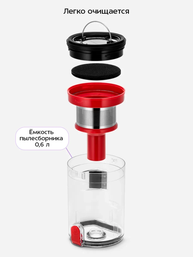 Пылесос оборудован современным циклонным фильтром, обеспечивающим хорошую очистку. Контейнер пылесборника легко открывается, а пыль из него вытряхивается очень просто. Внутри пылесборника находится фильтр тонкой очистки, поролоновый фильтр и фильтр грубой очистки c металлической сеткой, которые можно вынуть и почистить.