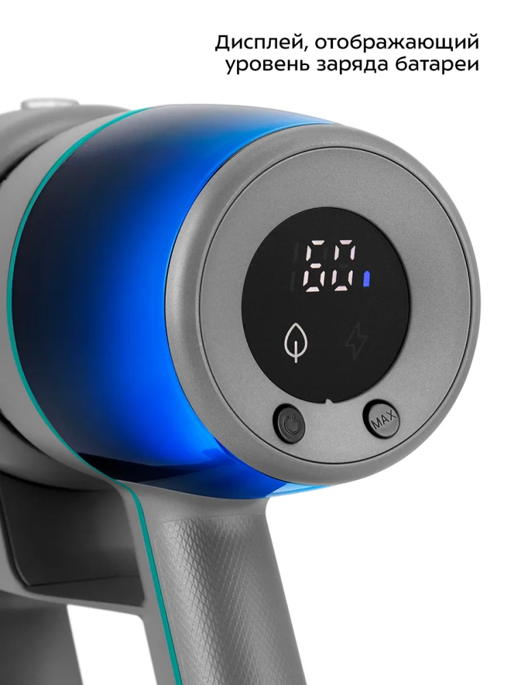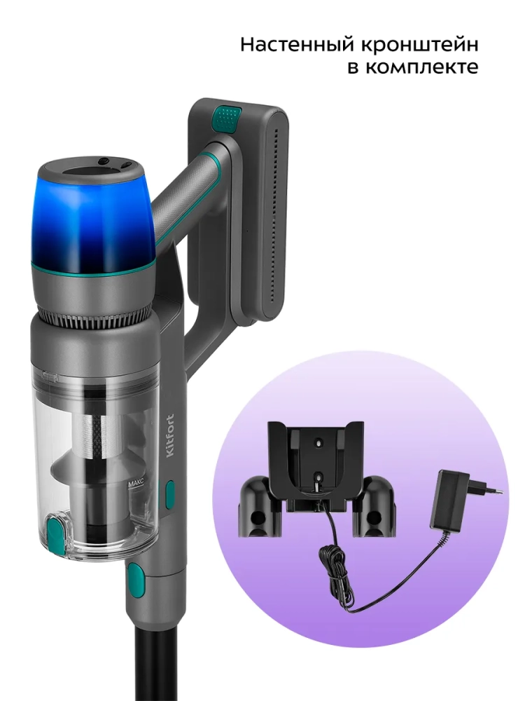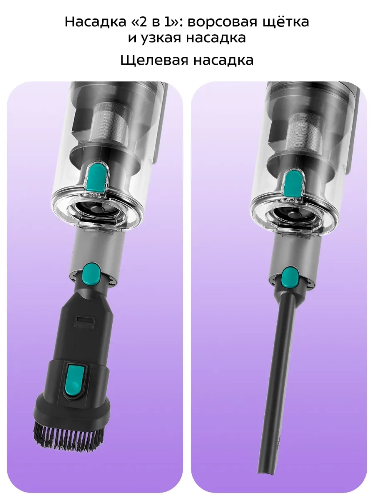 Пылесос комплектуется напольной насадкой с турбощеткой, которая помогает качественно справиться с очисткой гладких поверхностей и ковровых покрытий с не очень длинным ворсом. Светодиодная подсветка напольной щетки сделает уборку комфортной даже в затемненных местах. Также к пылесосу прилагаются насадка «2 в 1», щелевая насадка и кронштейн для настенного хранения устройства, у которого предусмотрено место для хранения насадок.