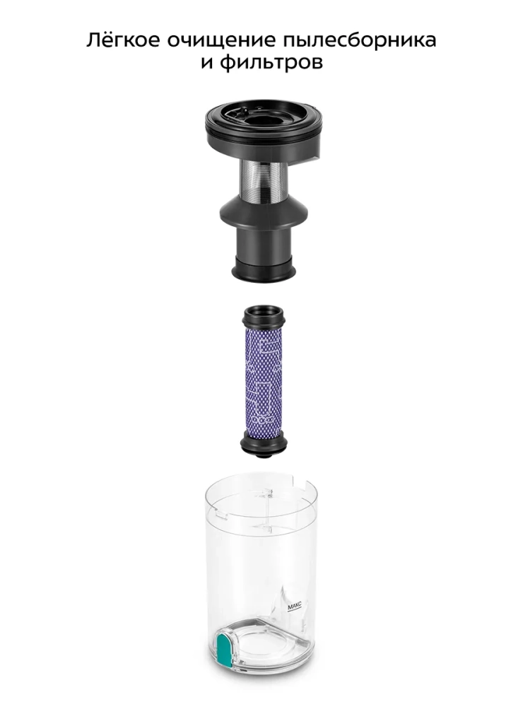 Пылесос оборудован современным циклонным фильтром, обеспечивающим хорошую очистку. Крышка пылесборника легко открывается, а пыль из него вытряхивается очень просто. Внутри пылесборника находится фильтр тонкой очистки и фильтр грубой очистки c металлической сеткой, которые можно вынуть и почистить.