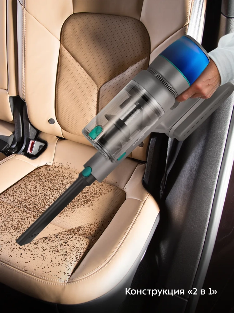 Конструкция «2 в 1» предусматривает наличие ручного пылесоса, который удобно использовать отдельно. Ручным пылесосом можно пропылесосить углы и плинтусы, обивку мебели, пыль со шкафов, шкафчики на кухне или в гостиной, книжные полки, коврики в автомобиле или багажник.