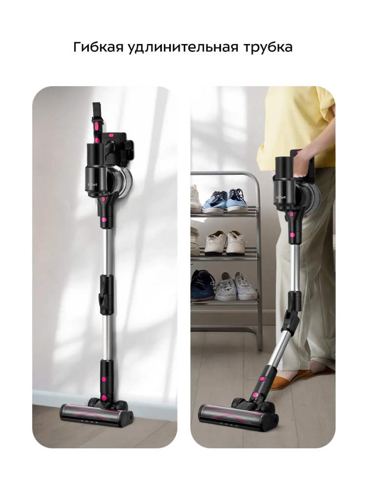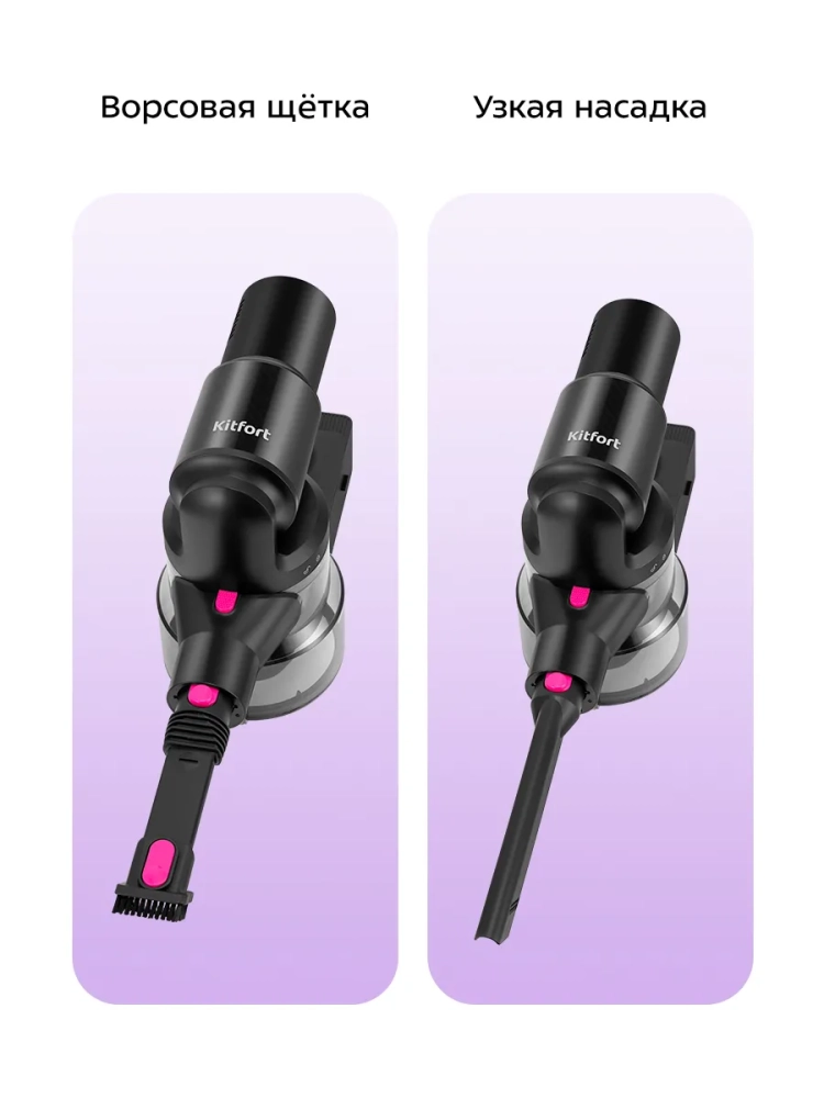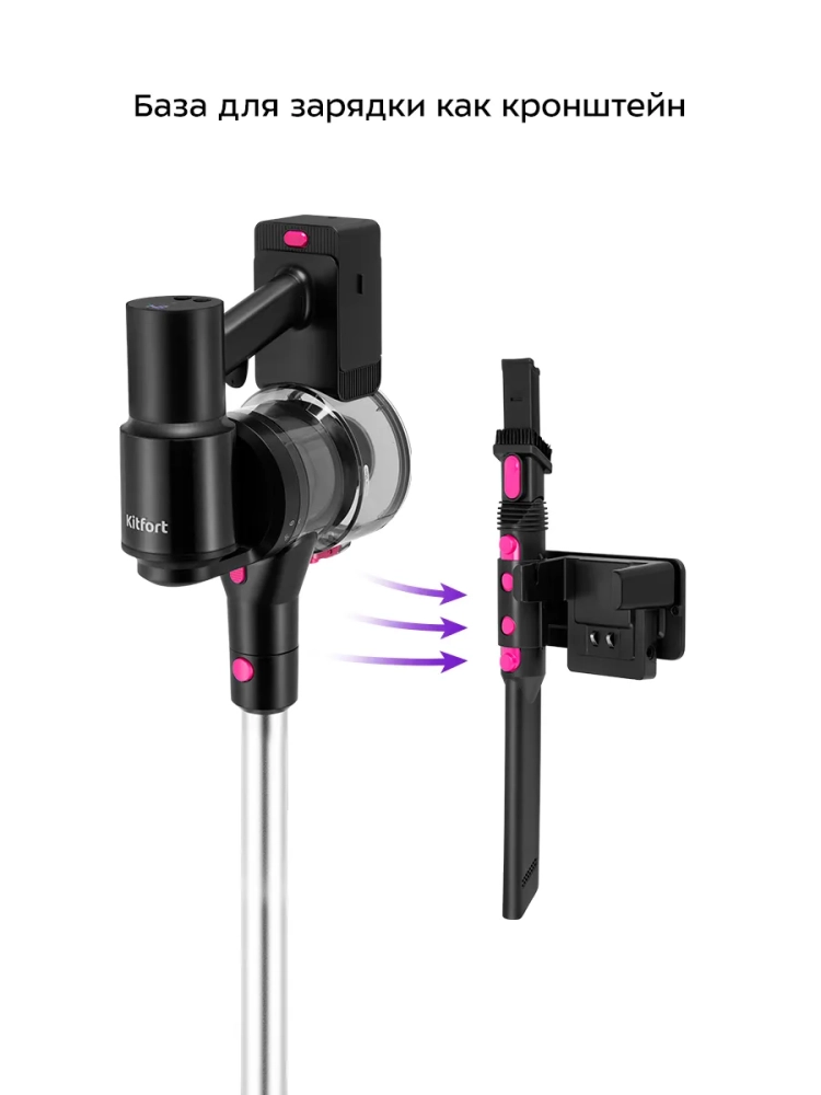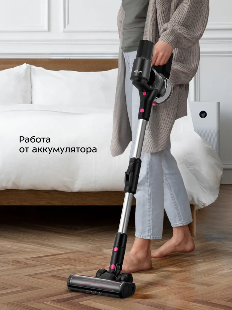 Беспроводной вертикальный пылесос Kitfort КТ-5388 очень удобен при локальной уборке. При отсоединении удлинительной трубки и установке насадки он превращается в ручной пылесос. Его конструкция позволяет легко проникать в самые труднодоступные уголки квартиры. Благодаря работе от аккумулятора не нужно включать вилку в розетку, провода не мешают под ногами. Пылесос оснащен маневренной напольной турбощеткой, которая вращается в двух плоскостях, и гибкой удлинительной трубкой, которая позволяет удобно выполнять уборку в труднодоступных местах.