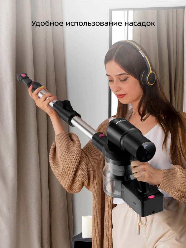 Пылесос комплектуется напольной насадкой с турбощеткой, которая помогает качественно справиться с очисткой гладких поверхностей и ковровых покрытий с не очень длинным ворсом. Светодиодная подсветка напольной щетки сделает уборку комфортной даже в затемненных местах. Также к пылесосу прилагаются насадка «2 в 1», щелевая насадка и база для зарядки и настенного хранения устройства, у которой также предусмотрено место для хранения насадок.