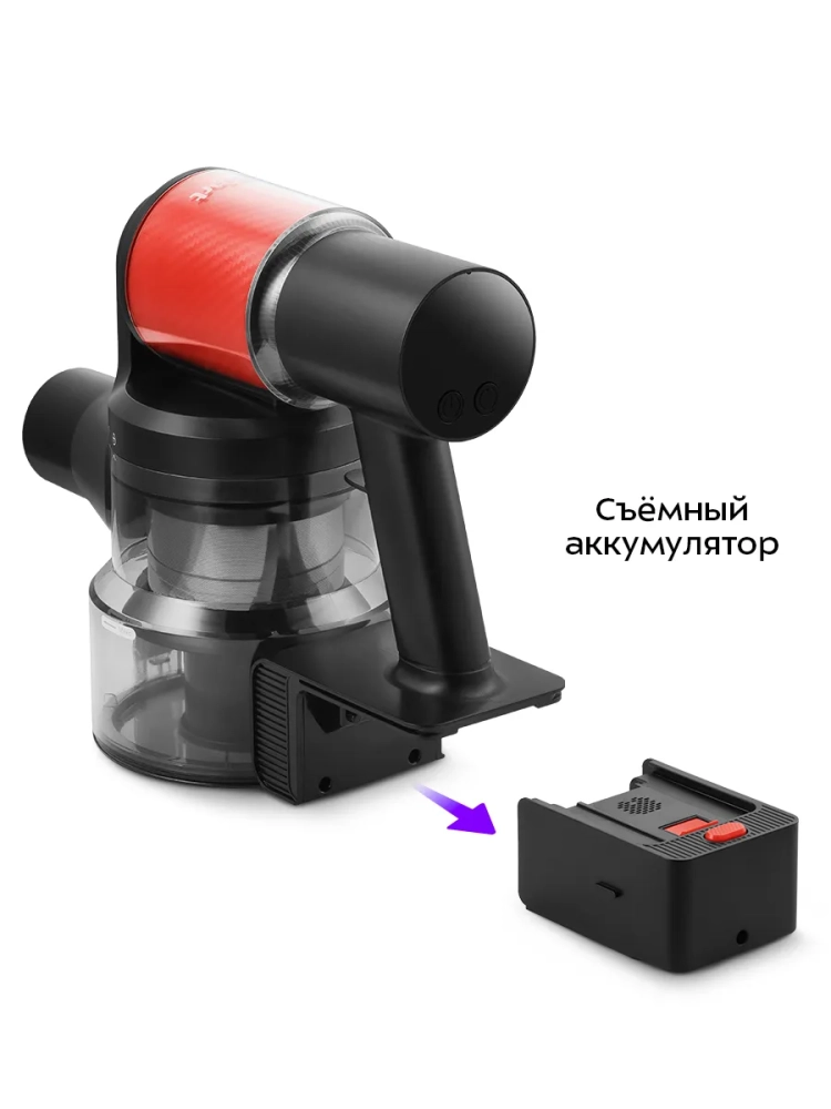 Пылесос комплектуется напольной насадкой с турбощеткой, которая помогает качественно справиться с очисткой гладких поверхностей и ковровых покрытий с не очень длинным ворсом. Светодиодная подсветка напольной щетки сделает уборку комфортной даже в затемненных местах. Также к пылесосу прилагаются насадка «2 в 1», щелевая насадка и база для зарядки и настенного хранения устройства, у которой также предусмотрено место для хранения насадок.