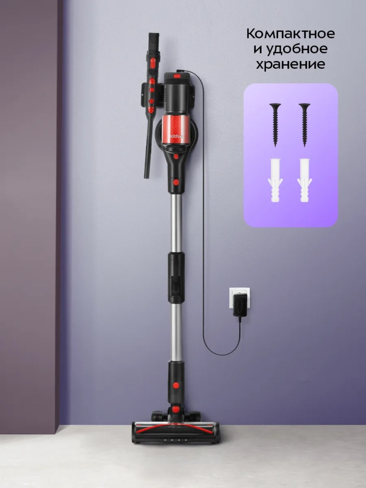 Одно из главных достоинств вертикального пылесоса — его компактность. У пылесоса нет функции вертикальной парковки, поэтому пылесос рекомендуется устанавливать на кронштейн из комплекта, который крепится к стене.