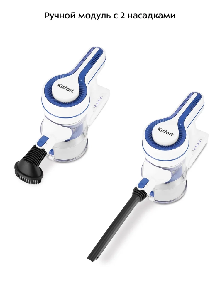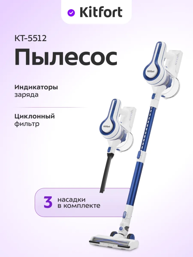 Беспроводной вертикальный пылесос Kitfort КТ-5512 очень удобен при локальной уборке. При отсоединении удлинительной трубки и установке насадки он превращается в ручной пылесос. Его конструкция позволяет легко проникать в самые труднодоступные уголки квартиры. Благодаря работе от аккумулятора не нужно включать вилку в розетку, провода не мешают под ногами. Пылесос оснащен маневренной напольной турбощеткой, которая вращается в двух плоскостях, и гибкой удлинительной трубкой, которая позволяет удобно выполнять уборку в труднодоступных местах.