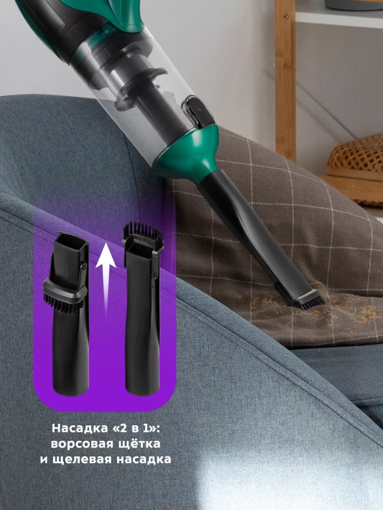 Конструкция «2 в 1» предусматривает наличие ручного пылесоса, который удобно использовать отдельно. Ручным пылесосом можно пропылесосить углы и плинтусы, обивку мебели, пыль со шкафов (куда обычным пылесосом очень трудно дотянуться из-за ограниченной длины шланга), шкафчики на кухне или в гостиной, книжные полки, коврики в автомобиле или багажник.