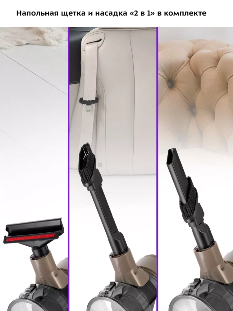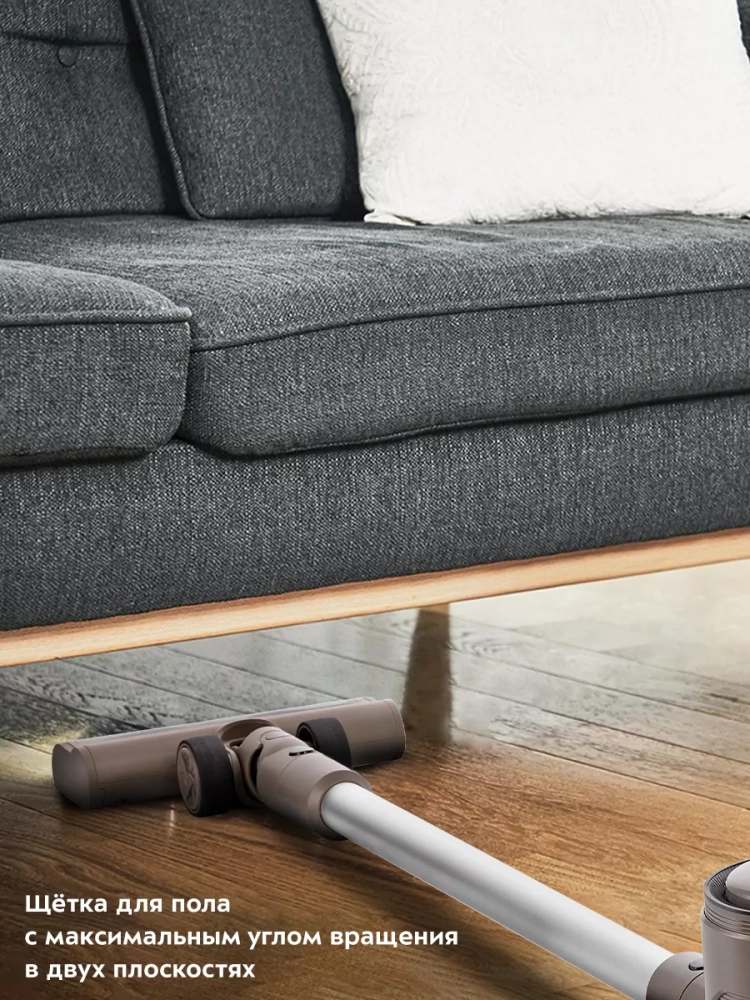 Пылесос комплектуется турбощеткой, которая помогает качественно справиться с очисткой гладких поверхностей и ковровых покрытий с не очень длинным ворсом. Светодиодная подсветка напольной щетки сделает уборку комфортной даже в затемненных местах. Также к пылесосу прилагаются насадка «2 в 1» и плоская насадка, а также кронштейн для настенного хранения устройства. Щетка для чистки из комплекта предназначена для чистки фильтров и оборудована ножом, которым очень удобно срезать волосы и шерсть с турбощетки при чистке.