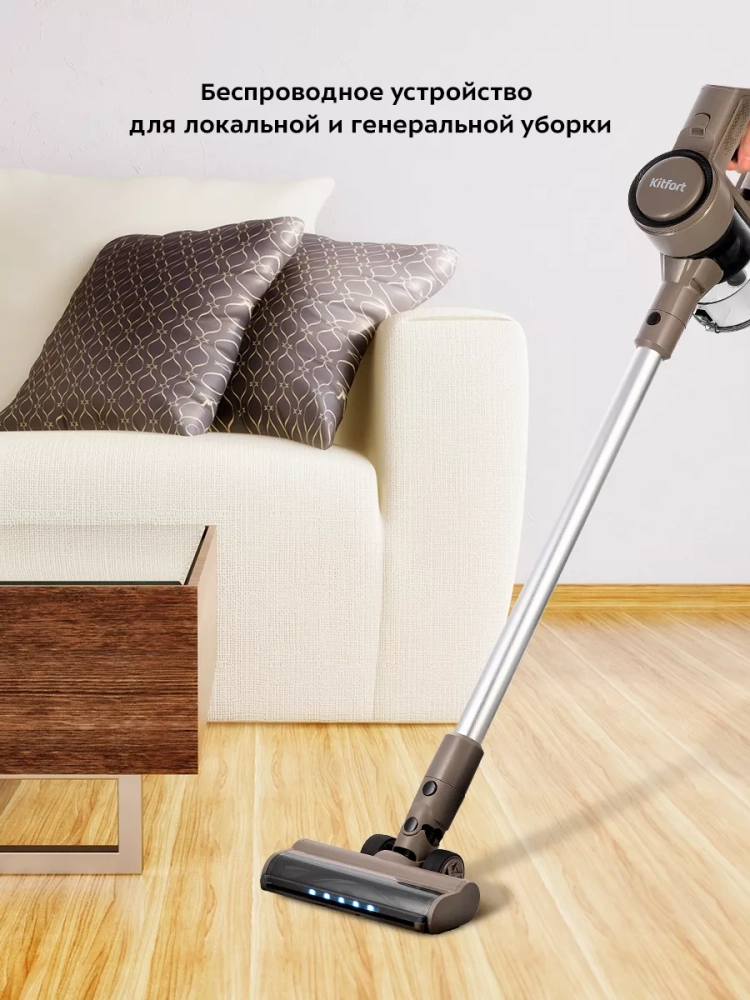 Беспроводной вертикальный пылесос Kitfort КТ-5252 очень удобен при локальной уборке. Пылесос имеет неограниченный радиус действия: от любого уголка квартиры до машины или беседки в саду. Пылесос оснащен маневренной напольной турбощеткой, которая вращается в двух плоскостях.