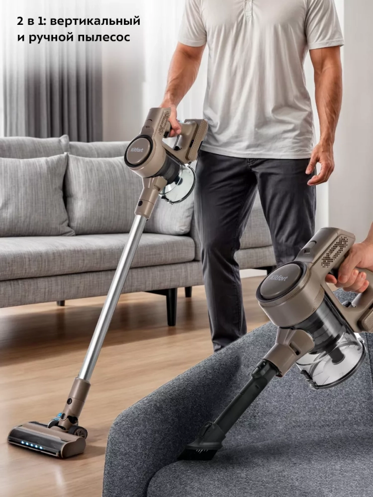 Конструкция «2 в 1» предусматривает наличие ручного пылесоса, который удобно использовать отдельно. Ручным пылесосом можно пропылесосить углы и плинтусы, обивку мебели, пыль со шкафов (куда обычным пылесосом очень трудно дотянуться из-за ограниченной длины шланга), шкафчики на кухне или в гостиной, книжные полки, коврики в автомобиле или багажник.