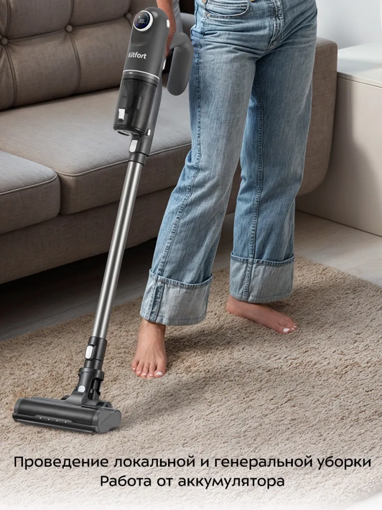 Беспроводной вертикальный пылесос Kitfort КТ-5287 очень удобен при локальной и генеральной уборке. Он компактен, всегда под рукой и готов к работе. При отсоединении удлинительной трубки и установке насадки он превращается в ручной пылесос. Его конструкция позволяет легко проникать в самые труднодоступные уголки квартиры.