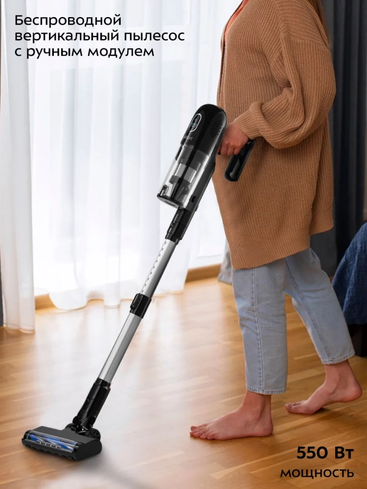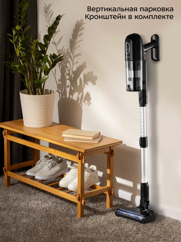 Одно из главных достоинств вертикального пылесоса — его компактность. Во время работы пылесос благодаря своей маневренности поможет легко убраться в узком коридоре или комнате, заполненной различными предметами. У пылесоса есть функция вертикальной парковки, поэтому пылесос удобно ставить в перерывах во время уборки. Для удобства хранения в комплекте поставляется кронштейн, который крепится к стене.