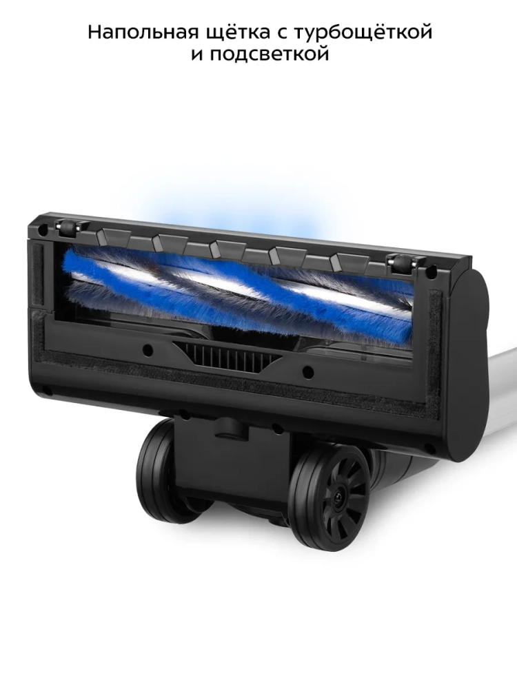 Пылесос комплектуется напольной насадкой с турбощеткой, которая помогает качественно справиться с очисткой гладких поверхностей и ковровых покрытий с не очень длинным ворсом. Светодиодная подсветка напольной щетки сделает уборку комфортной даже в затемненных местах. Также к пылесосу прилагаются насадка «2 в 1» и щелевая насадка и кронштейн для настенного хранения устройства.
