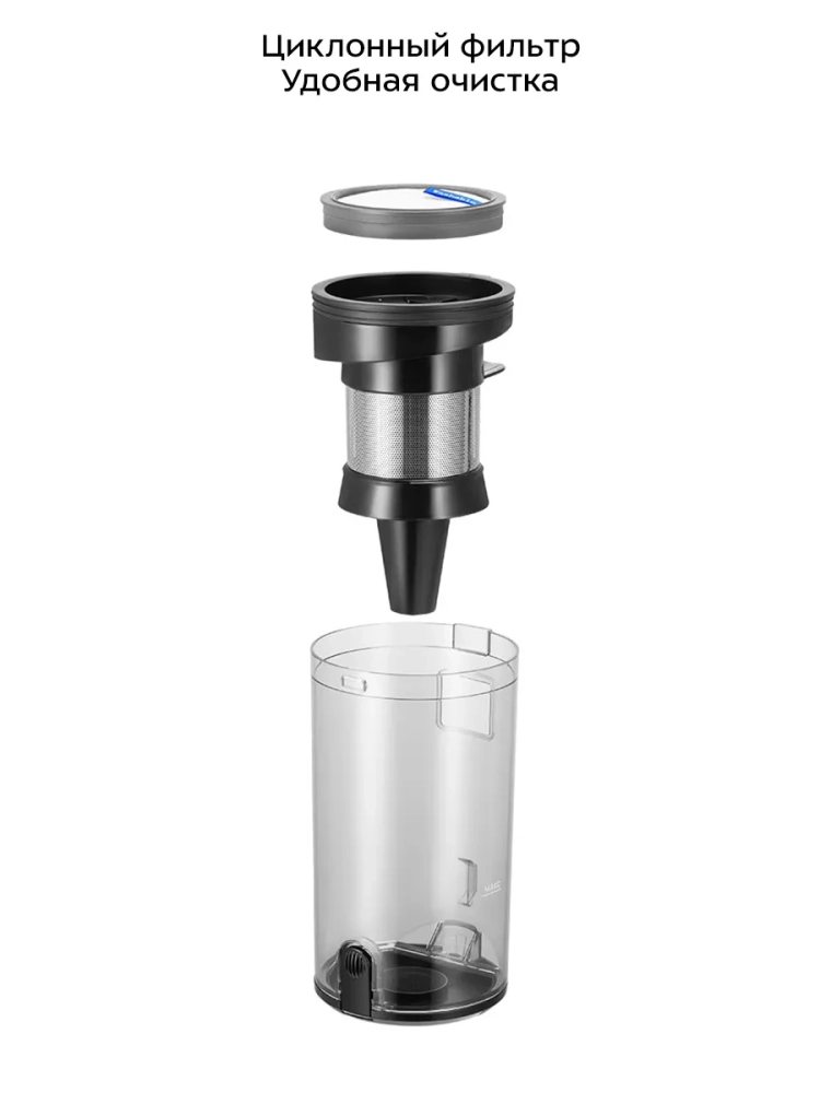 Пылесос оборудован современным циклонным фильтром, обеспечивающим хорошую очистку. Крышка пылесборника легко открывается, из него очень просто вытряхивать пыль. Внутри пылесборника находится фильтр тонкой очистки и фильтр грубой очистки c металлической сеткой, которые можно вынуть и почистить.
