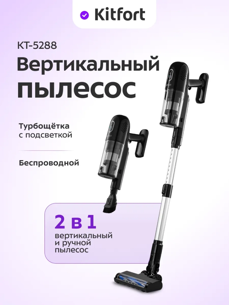 Беспроводной вертикальный пылесос Kitfort КТ-5288 очень удобен при локальной уборке. При отсоединении удлинительной трубки и установке насадки он превращается в ручной пылесос. Его конструкция позволяет легко проникать в самые труднодоступные уголки квартиры. Благодаря работе от аккумулятора не нужно включать вилку в розетку, а провода не мешают под ногами. Пылесос оснащен маневренной напольной турбощеткой, которая вращается в двух плоскостях.