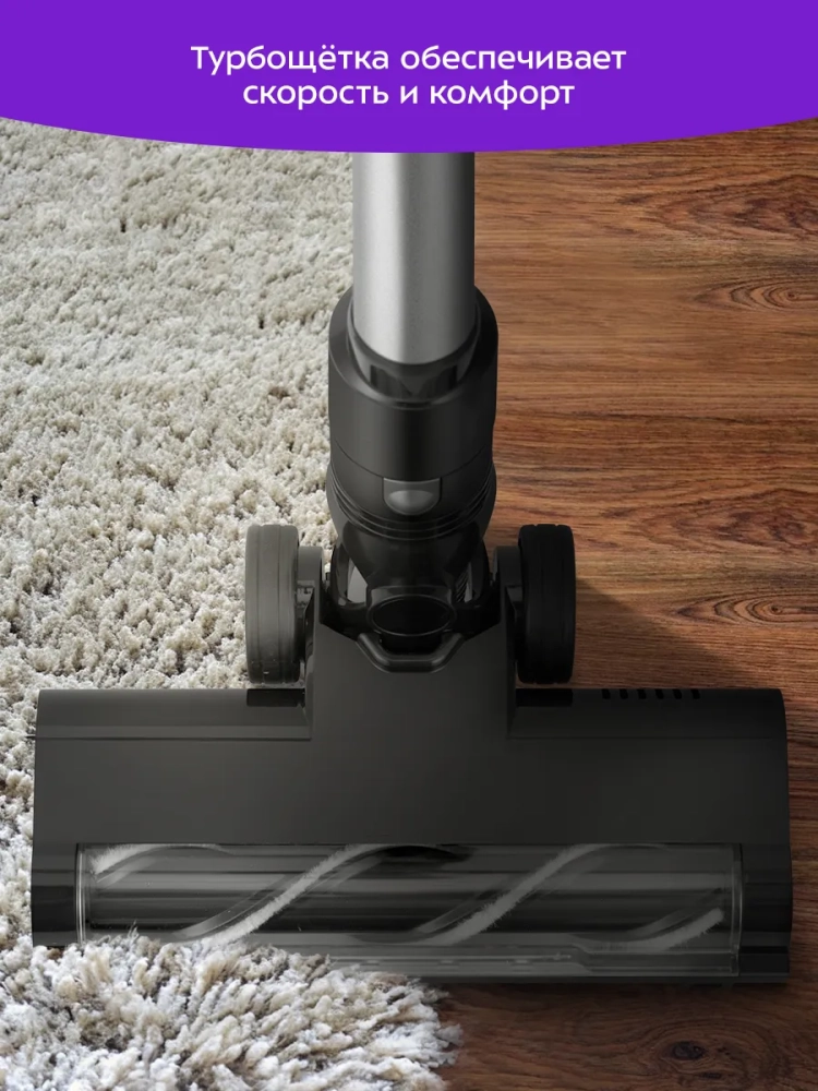 Пылесос комплектуется напольной насадкой с турбощеткой, которая помогает качественно справиться с очисткой гладких поверхностей и ковровых покрытий с не очень длинным ворсом. Светодиодная подсветка напольной щетки сделает уборку комфортной даже в затемненных местах. Также к пылесосу прилагаются насадка «2 в 1», щелевая насадка и кронштейн для настенного хранения устройства. Гибкая удлинительная трубка позволяет очистить напольные покрытия в труднодоступных местах: под диванами, кроватями, шкафами и другой мебелью.