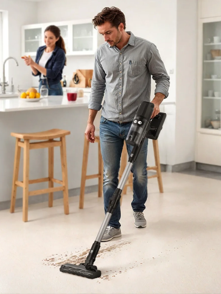 Одно из главных достоинств вертикального пылесоса — его компактность. Во время работы пылесос благодаря своей маневренности поможет легко убраться в узком коридоре или комнате, заполненной различными предметами. У пылесоса есть функция вертикальной парковки, поэтому пылесос удобно ставить в перерывах во время уборки. Для удобства хранения в комплекте поставляется кронштейн, который крепится к стене.
