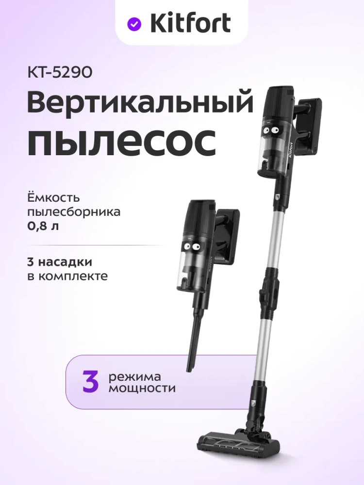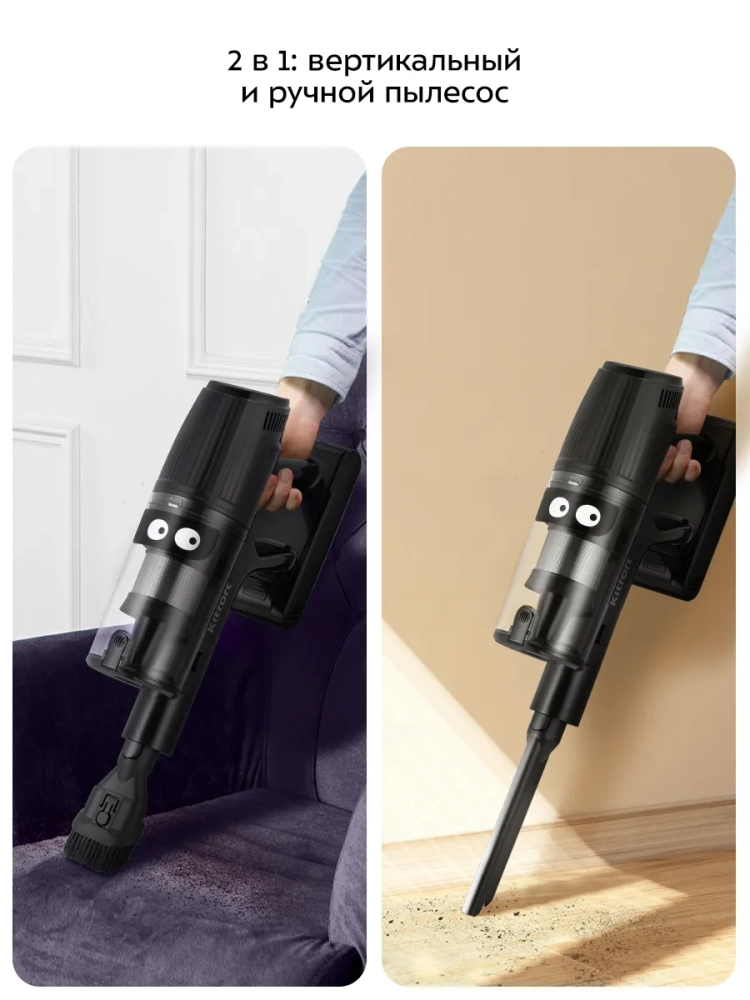 Беспроводной вертикальный пылесос Kitfort КТ-5290 очень удобен при локальной уборке. Он компактен, всегда под рукой и готов к работе. При отсоединении удлинительной трубки и установке насадки он превращается в ручной пылесос. Его конструкция позволяет легко проникать в самые труднодоступные уголки квартиры. При этом не нужно передвигать громоздкий корпус проводного пылесоса и управляться с непослушным шлангом. Благодаря работе от аккумулятора не нужно включать вилку в розетку, провода не мешают под ногами. Пылесос оснащен маневренной напольной турбощеткой, которая вращается в двух плоскостях.