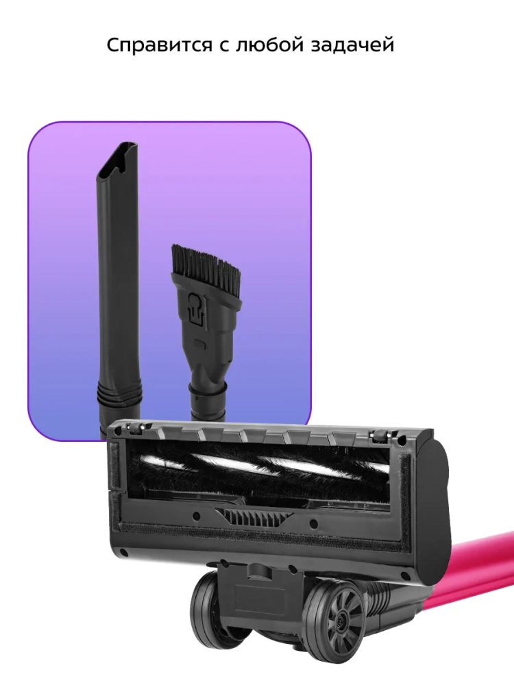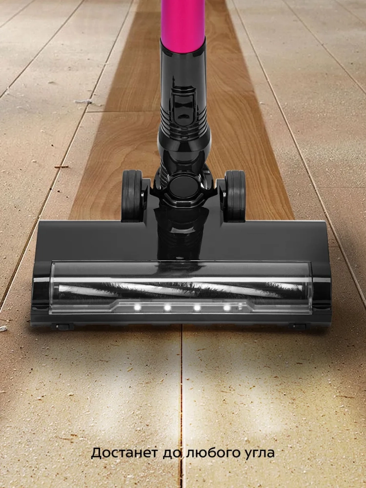 Пылесос комплектуется напольной насадкой с турбощеткой, которая помогает качественно справиться с чисткой гладких поверхностей и ковровых покрытий с не очень длинным ворсом. Светодиодная подсветка напольной щетки сделает уборку комфортной даже в затемненных местах. Также к пылесосу прилагаются насадка «2 в 1», щелевая насадка и кронштейн для настенного хранения устройства.