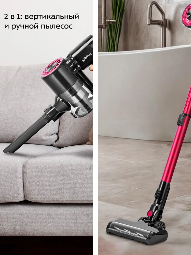 Беспроводной вертикальный пылесос Kitfort КТ-5291 очень удобен при локальной уборке. Он компактен, всегда под рукой и готов к работе. При отсоединении удлинительной трубки и установке насадки он превращается в ручной пылесос. Его конструкция позволяет легко проникать в самые труднодоступные уголки квартиры. При этом не нужно передвигать громоздкий корпус проводного пылесоса и управляться с непослушным шлангом. Благодаря работе от аккумулятора не нужно включать вилку в розетку, провода не мешают под ногами. Поэтому пылесос имеет неограниченный радиус действия: от любого уголка квартиры до машины или беседки в саду. Пылесос оснащен маневренной напольной турбощеткой, которая вращается в двух плоскостях.