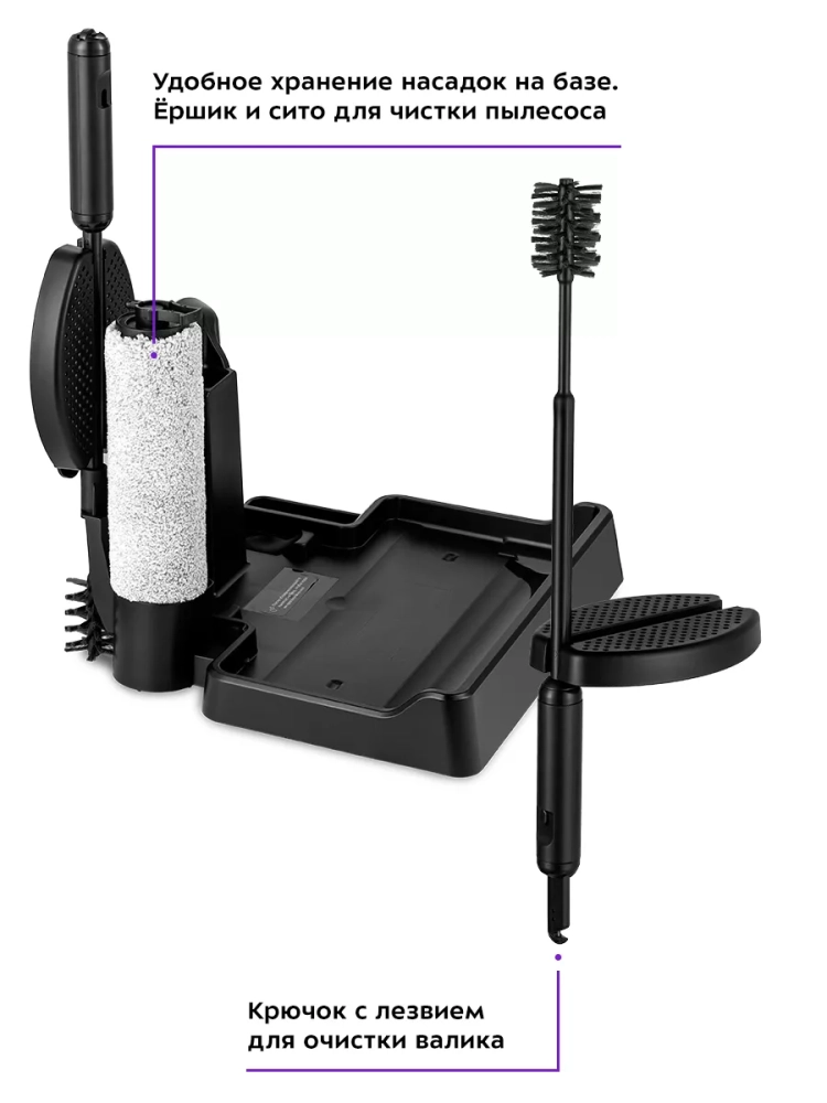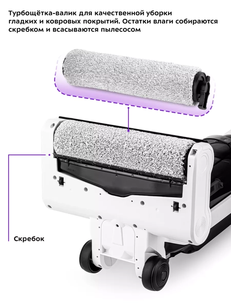 В щетку прибора встроен специальный скребок, который вытирает лишнюю влагу от турбощетки-валика. В результате пол после уборки не такой влажный, как если бы мы убирались паровыми швабрами или другими моющими пылесосами.