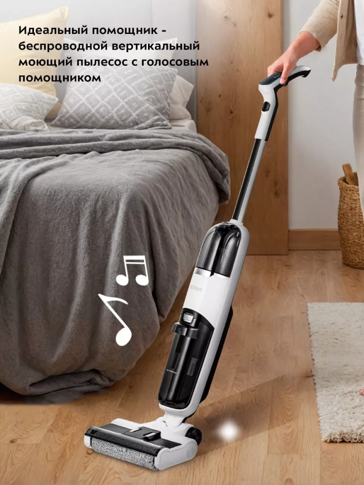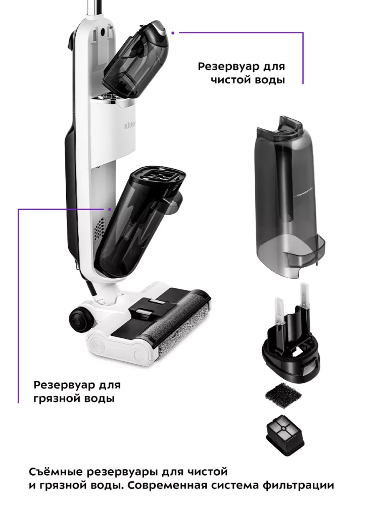 Беспроводной вертикальный моющий пылесос Kitfort КТ-5155 очень удобен при локальной уборке. Он компактен, всегда под рукой и готов к работе. Данная модель не только пылесосит, но и моет пол, а провода не будут мешаться под ногами, потому что пылесос работает от аккумулятора.