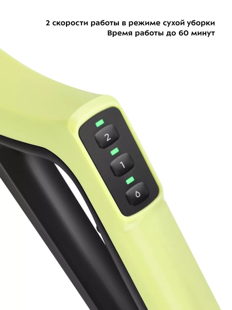 Пылесос имеет две скорости работы (сухая уборка) и режим влажной уборки. На первой скорости вы можете пылесосить в течение 60 минут, на второй — в течение 30 минут. Заряда аккумулятора хватает на 60 минут влажной уборки. Если вы попеременно включаете пылесос и влажную уборку, прибор будет работать непрерывно около 40 минут.