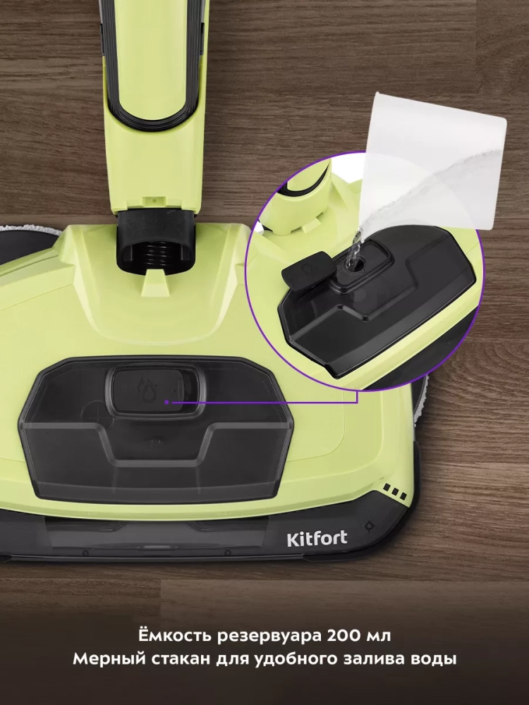 В комплекте предусмотрены ворсовая насадка, которую можно надеть на ручной модуль пылесоса, и мерный стакан для удобного наливания воды в резервуар щетки для пола.