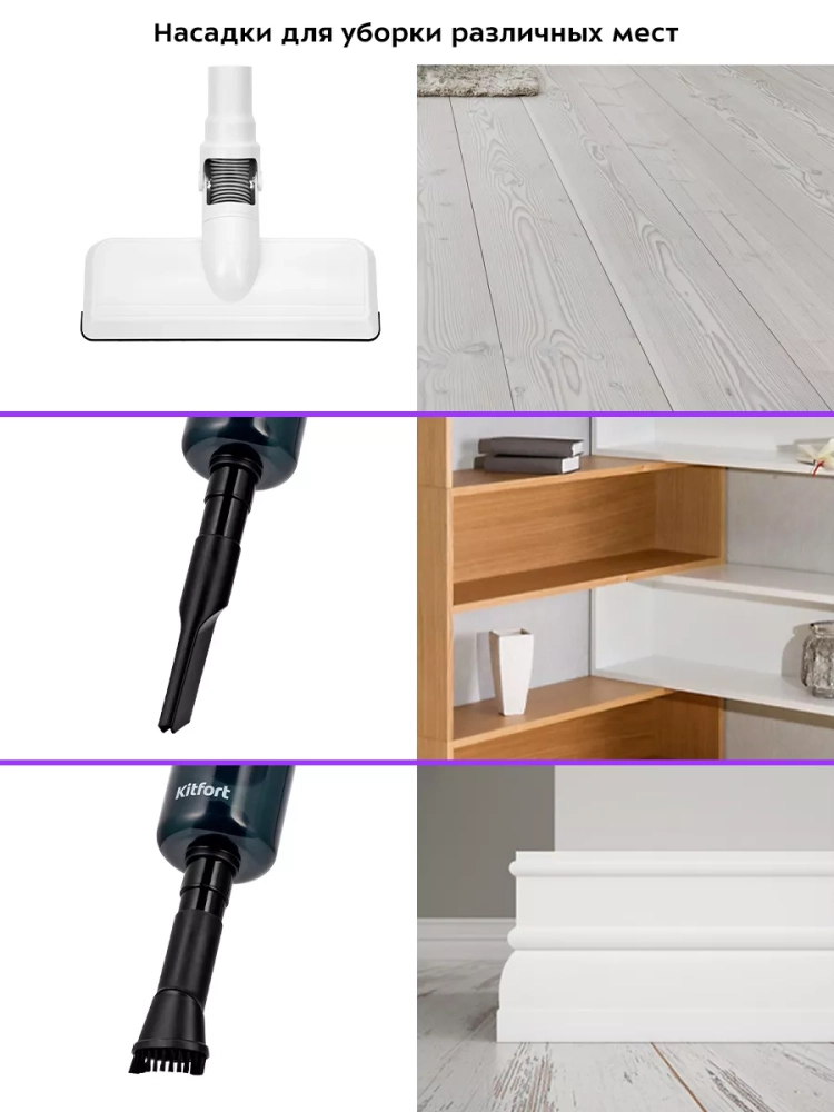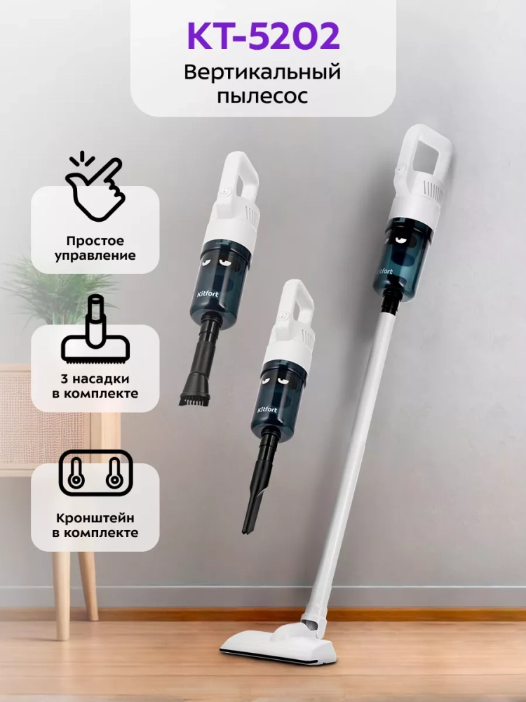 Вертикальный пылесос Kitfort КТ-5202 очень удобен при локальной уборке. Он компактен, всегда под рукой и готов к работе. При отсоединении удлинительной трубки и установке насадки он превращается в ручной пылесос. Пылесос оснащен маневренной напольной щеткой, которая вращается в двух плоскостях.