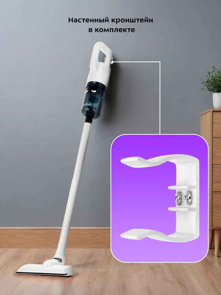 Одно из главных достоинств вертикального пылесоса — его компактность. Во время работы пылесос благодаря своей маневренности может легко убраться в узком коридоре или комнате, заполненной различными предметами. У пылесоса нет функции вертикальной парковки, поэтому пылесос рекомендуется устанавливать на стену с помощью кронштейна, идущего в комплекте.