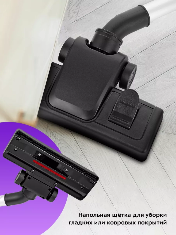 Пылесос комплектуется напольной щеткой, которая помогает качественно справиться с очисткой гладких поверхностей и ковровых покрытий с не очень длинным ворсом. Также к пылесосу прилагаются щелевая насадка и насадка «2 в 1», а также кронштейн для настенного хранения устройства и насадок.
