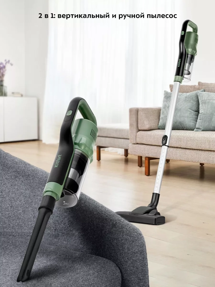 Конструкция «2 в 1» предусматривает наличие ручного пылесоса, который удобно использовать отдельно. Ручным пылесосом можно пропылесосить углы и плинтусы, обивку мебели, пыль со шкафов (куда обычным пылесосом очень трудно дотянуться из-за ограниченной длины шланга), шкафчики на кухне или в гостиной, книжные полки, коврики в автомобиле или багажник.