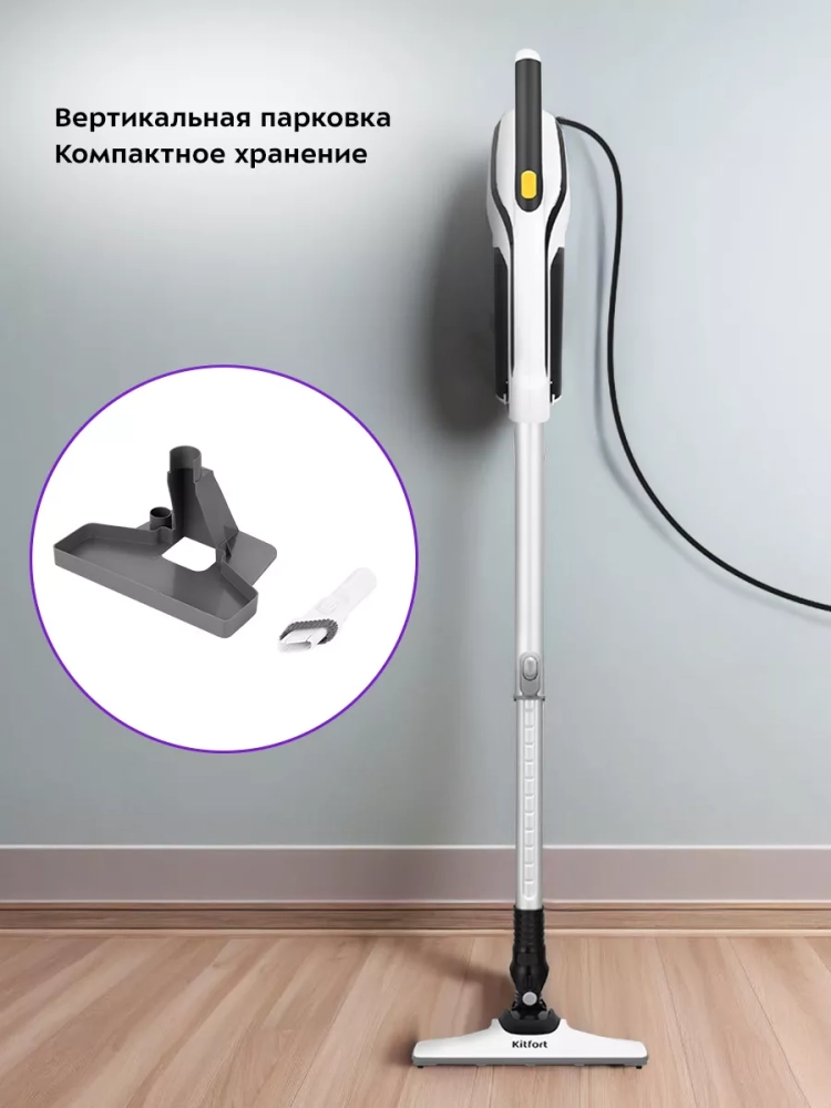 Вертикальный пылесос Kitfort КТ-5262 очень удобен при локальной уборке. Он компактен, всегда под рукой и готов к работе. При установке насадки и отсоединении удлинительной трубки он превращается в ручной пылесос. Конструкция пылесоса позволяет легко проникать в труднодоступные уголки квартиры. При этом не нужно передвигать громоздкий корпус прибора и управляться с непослушным шлангом. Пылесос оснащен маневренной напольной щеткой, которая вращается в двух плоскостях.