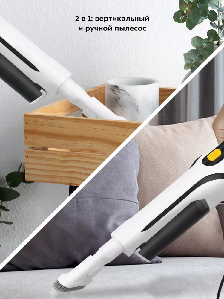 Конструкция «2 в 1» предусматривает наличие ручного пылесоса, который удобно использовать отдельно. Ручным пылесосом можно пропылесосить углы и плинтусы, обивку мебели, пыль со шкафов (куда обычным пылесосом очень трудно дотянуться из-за ограниченной длины шланга), шкафчики на кухне или в гостиной, книжные полки, коврики в автомобиле или багажник.