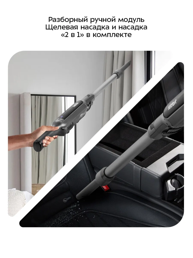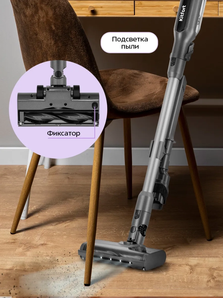 Беспроводной вертикальный пылесос Kitfort КТ-5297 очень удобен при локальной уборке. Он компактен, всегда под рукой и готов к работе. При отсоединении удлинительной трубки и установке насадки он превращается в ручной пылесос. Его конструкция позволяет легко проникать в самые труднодоступные уголки квартиры. При этом не нужно передвигать громоздкий корпус проводного пылесоса и управляться с непослушным шлангом. Благодаря работе от аккумулятора не нужно включать вилку в розетку, провода не мешают под ногами. Поэтому пылесос имеет неограниченный радиус действия: от любого уголка квартиры до машины или беседки в саду. Пылесос оснащен маневренной напольной турбощеткой, которая вращается в двух плоскостях.