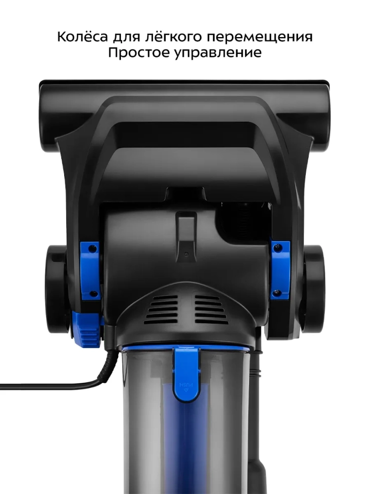 Пылесос оснащен колесами для легкого перемещения во время уборки. У пылесоса простое управление. Кнопку включения на моторном блоке устройства можно нажать ногой, при этом не наклоняясь.