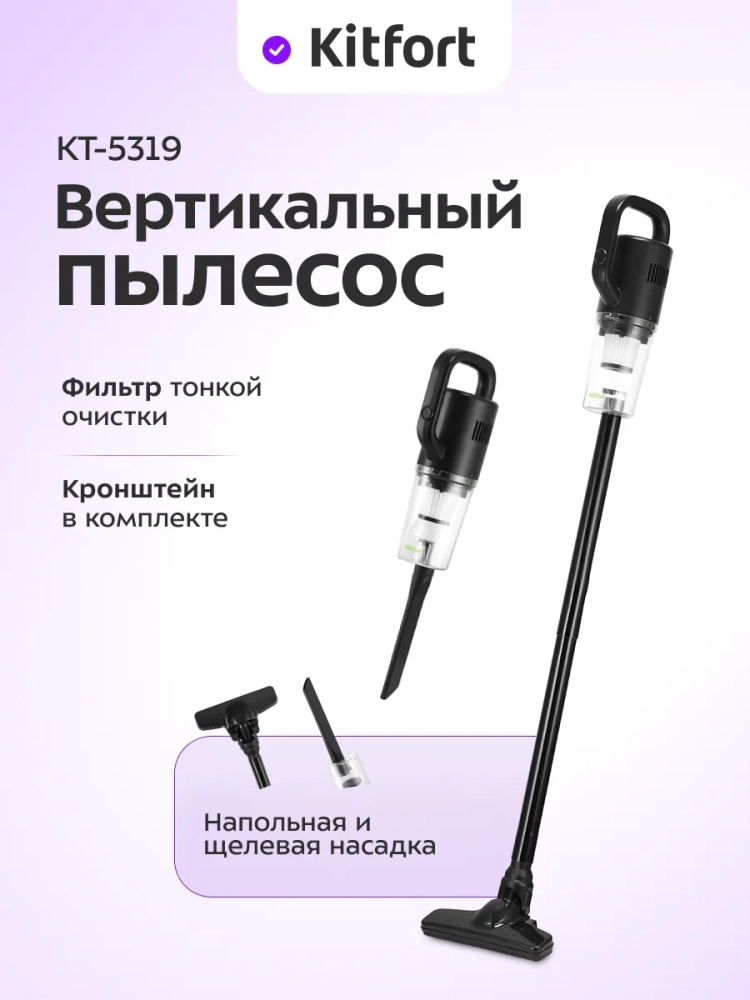 Вертикальный пылесос Kitfort КТ-5319 очень удобен при локальной уборке. Он компактен, всегда под рукой и готов к работе. При отсоединении удлинительной трубки и установке насадки он превращается в ручной пылесос. Его конструкция позволяет легко проникать в самые труднодоступные уголки квартиры. При этом не нужно передвигать громоздкий корпус прибора и управляться с непослушным шлангом. Пылесос оснащен маневренной напольной насадкой, которая вращается в двух плоскостях.