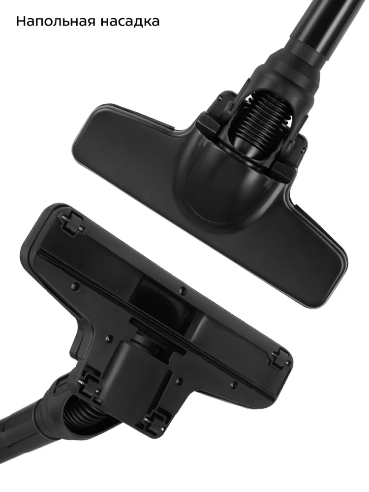 Пылесос комплектуется напольной насадкой, которая помогает качественно справиться с очисткой гладких поверхностей и ковровых покрытий с коротким ворсом. Также к пылесосу прилагается щелевая насадка и кронштейн для настенного хранения устройства.