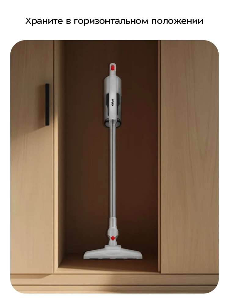 Вертикальный пылесос Kitfort КТ-5339 очень удобен при локальной уборке. Он компактен, всегда под рукой и готов к работе. При отсоединении удлинительной трубки и установке насадки он превращается в ручной пылесос. Его конструкция позволяет легко проникать в труднодоступные уголки квартиры. Пылесос оснащен маневренной щеткой для пола, которая вращается в двух плоскостях.