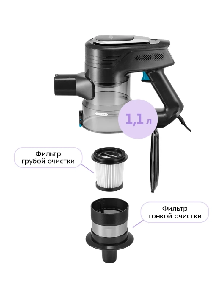 Пылесос оборудован современным циклонным фильтром, обеспечивающим хорошую очистку. Крышка пылесборника легко открывается, а пыль из него вытряхивается очень просто. Внутри пылесборника находится фильтр тонкой очистки и фильтр грубой очистки c металлической сеткой, которые можно вынуть и почистить.