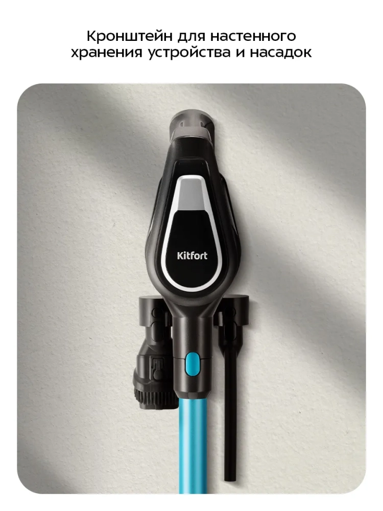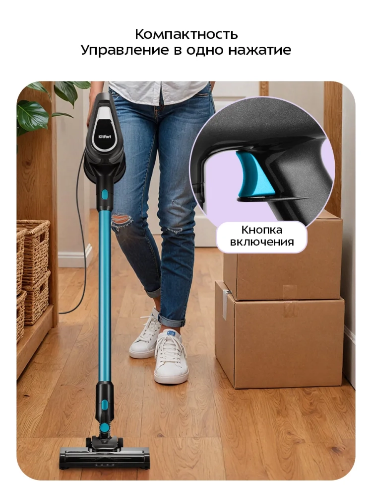 Вертикальный пылесос Kitfort КТ-5390 очень удобен при локальной уборке. Он компактен, всегда под рукой и готов к работе. При отсоединении удлинительной трубки и установке насадки он превращается в ручной пылесос. Его конструкция позволяет легко проникать в самые труднодоступные уголки квартиры. При этом не нужно передвигать громоздкий корпус прибора и управляться с непослушным шлангом. Пылесос оснащен маневренной напольной щеткой, которая вращается в двух плоскостях.