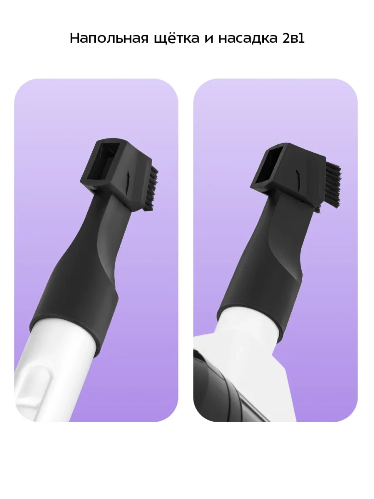 Пылесос комплектуется напольной щеткой, которая помогает качественно справиться с очисткой гладких поверхностей и ковровых покрытий с не очень длинным ворсом. У напольной щетки есть переключение для уборки гладких и ковровых покрытий. Также к пылесосу прилагаются насадка «2 в 1» и кронштейн для настенного хранения устройства. Насадка «2 в 1» может использоваться как щелевая или ворсовая насадка.