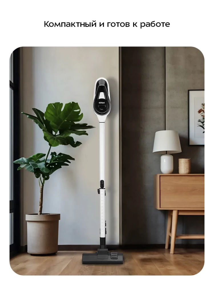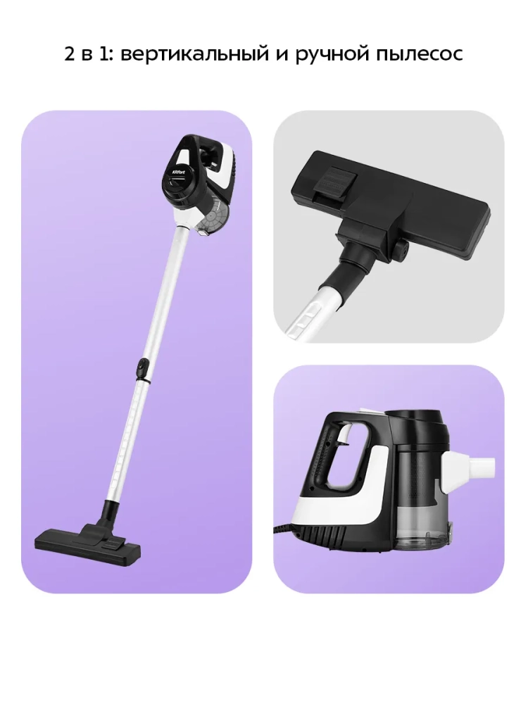 Вертикальный пылесос Kitfort КТ-5391 очень удобен при локальной уборке. Он компактен, всегда под рукой и готов к работе. При отсоединении удлинительной трубки и установке насадки он превращается в ручной пылесос. Его конструкция позволяет легко проникать в самые труднодоступные уголки квартиры. При этом не нужно передвигать громоздкий корпус прибора и управляться с непослушным шлангом. Пылесос оснащен маневренной напольной щеткой, которая вращается в двух плоскостях.