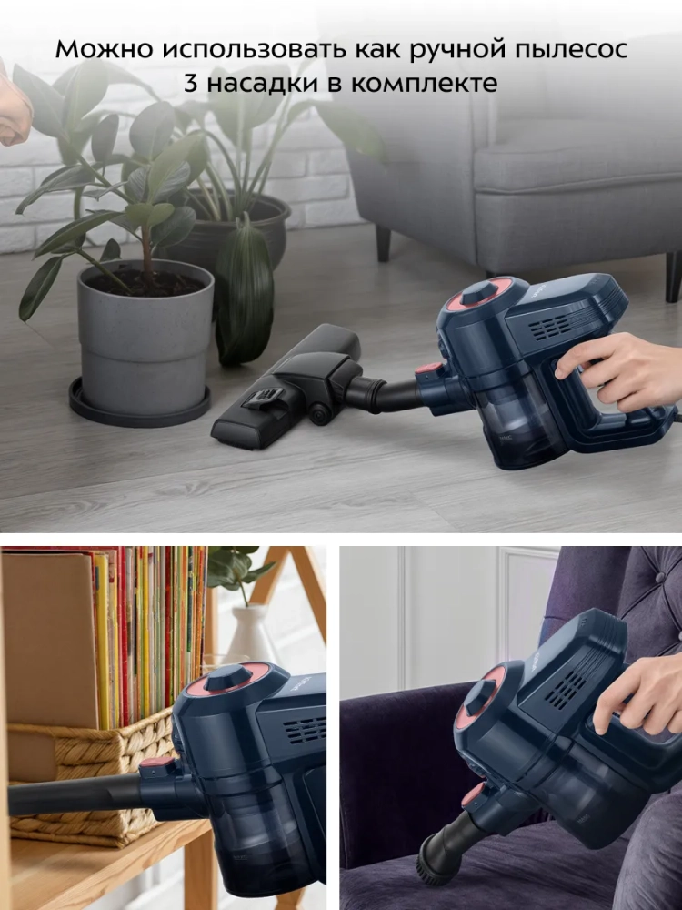 Конструкция «2 в 1» предусматривает наличие ручного пылесоса, который удобно использовать отдельно. Ручным пылесосом можно пропылесосить углы и плинтусы, обивку мебели, пыль со шкафов, шкафчики на кухне или в гостиной, книжные полки, коврики в автомобиле или багажник.