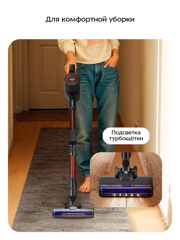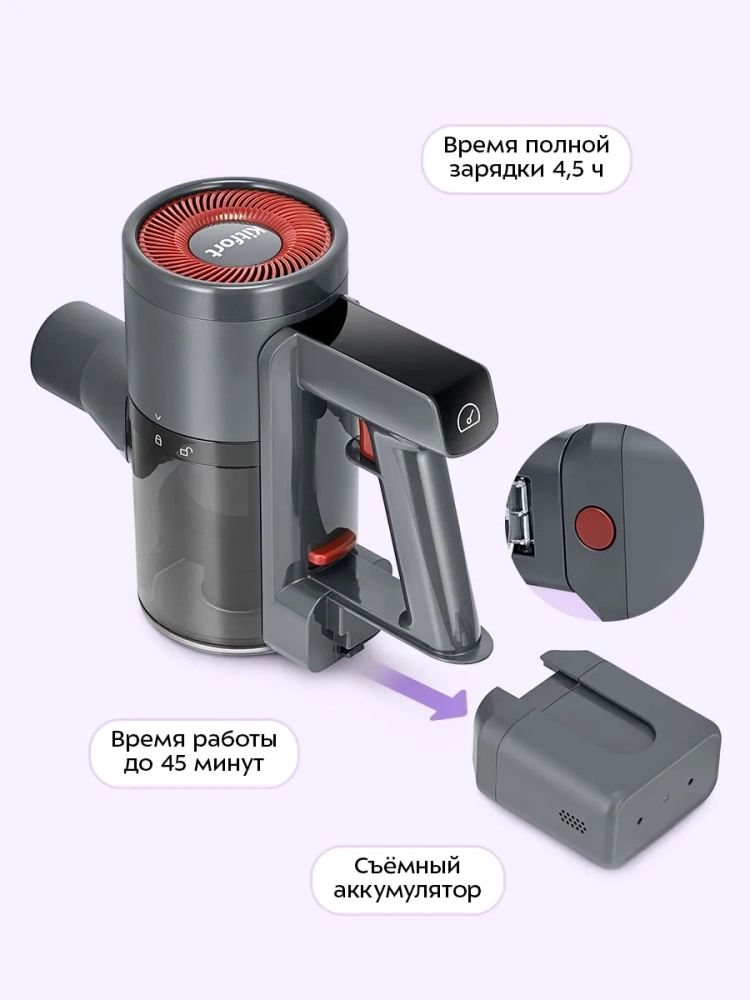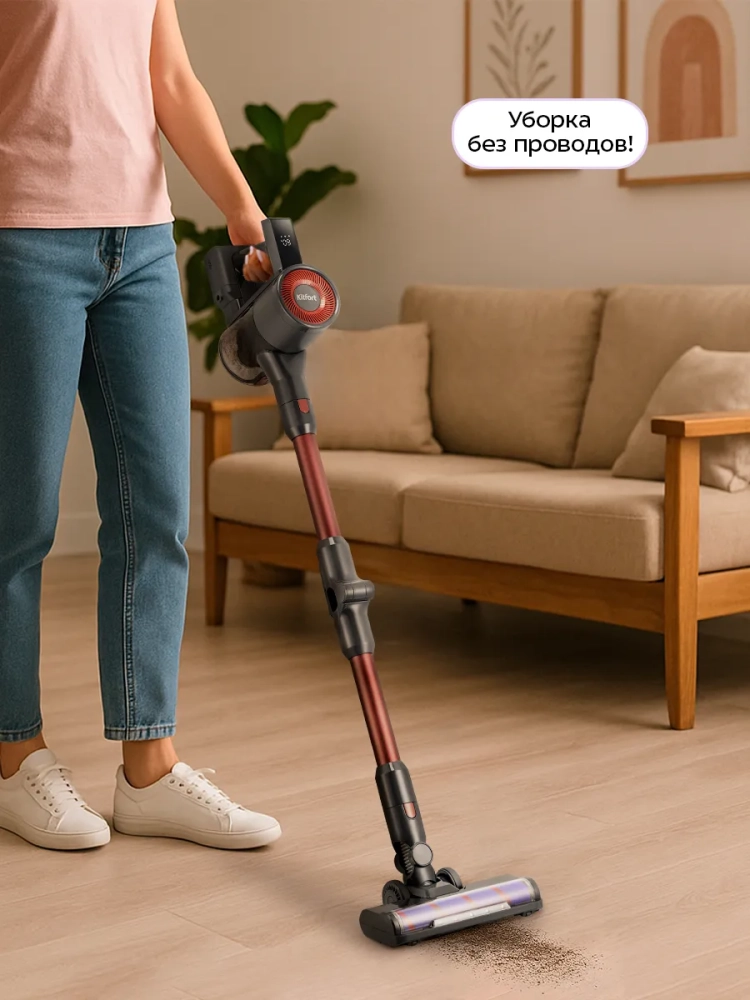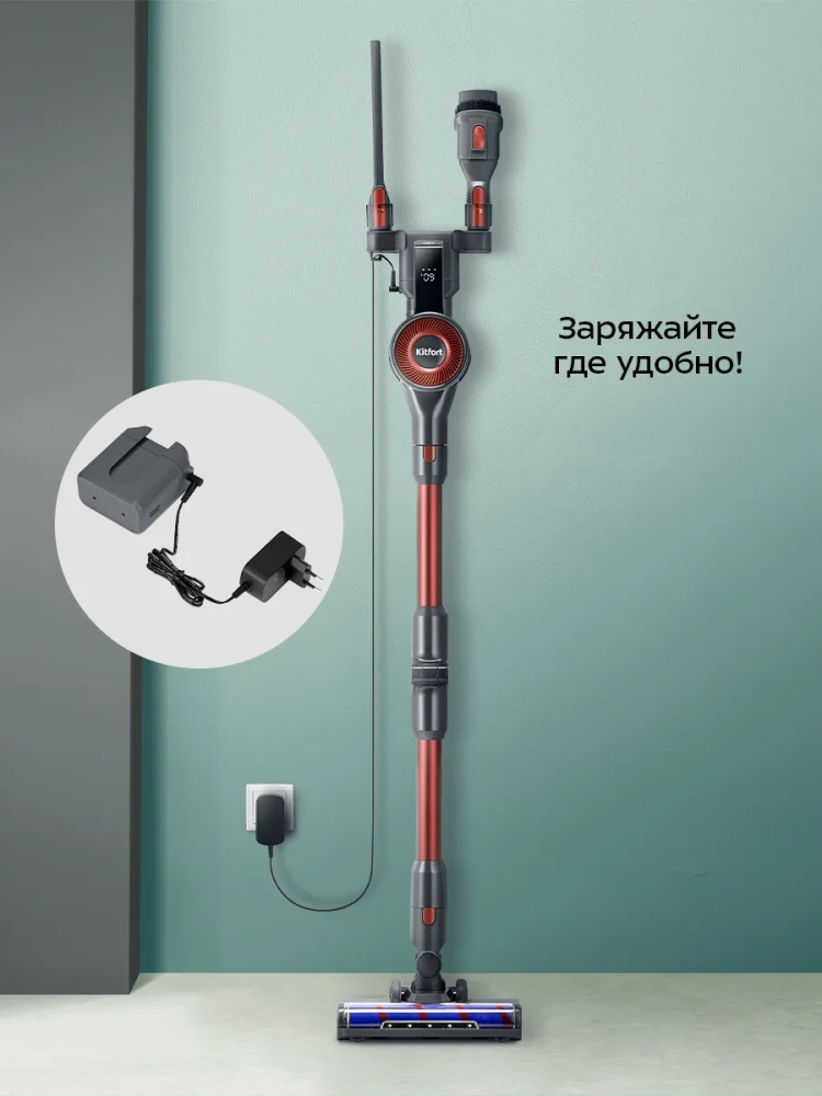 Беспроводной вертикальный пылесос Kitfort КТ-5539 очень удобен при локальной уборке. Он компактен, всегда под рукой и готов к работе. При отсоединении удлинительной трубки и установке насадки он превращается в ручной пылесос. Его конструкция позволяет легко проникать в самые труднодоступные уголки квартиры. При этом не нужно передвигать громоздкий корпус проводного пылесоса и управляться с непослушным шлангом. Благодаря работе от аккумулятора не нужно включать вилку в розетку, провода не мешают под ногами. Поэтому пылесос имеет неограниченный радиус действия: от любого уголка квартиры до машины или беседки в саду. Пылесос оснащен маневренной напольной турбощеткой, которая вращается в двух плоскостях. Гибкая удлинительная трубка позволяет убираться в труднодоступных местах, например под диваном.
