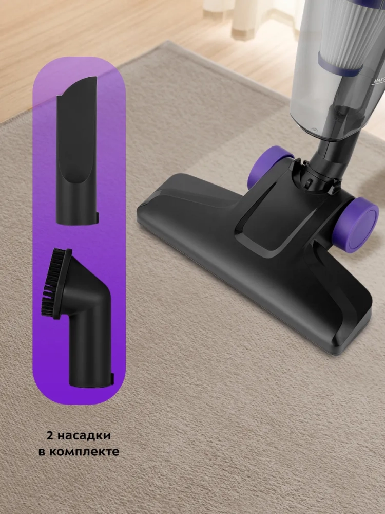 Конструкция «2 в 1» предусматривает наличие ручного пылесоса, который удобно использовать отдельно. Ручным пылесосом можно пропылесосить углы и плинтусы, обивку мебели, пыль со шкафов, книжные полки, шкафчики на кухне или в гостиной. Дополнительные насадки в комплекте значительно облегчают процесс уборки.