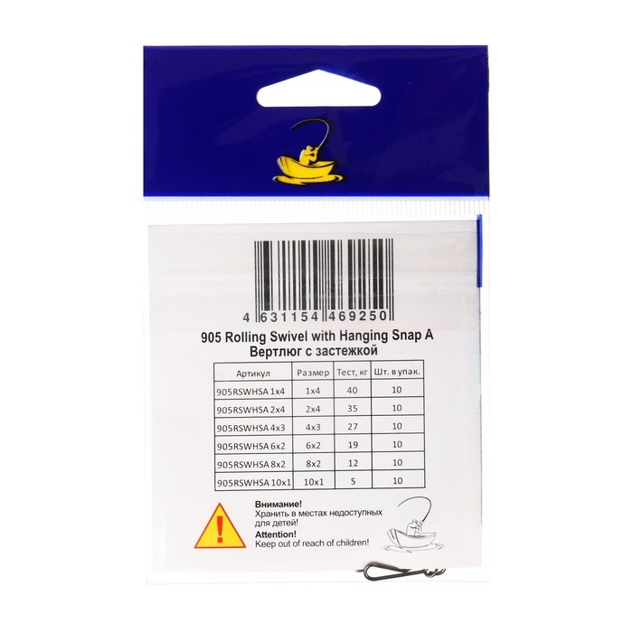 Вертлюг с застежкой Волжанка 905 Rolling Swivel with Hanging Snap A № 6х2, тест 19 кг, 5 шт